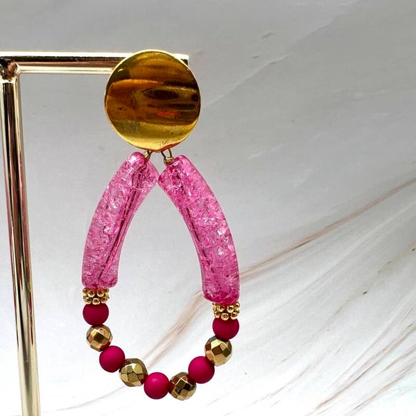 De totale lengte van de oorbel is 70mm. De oorhangers zijn van RVS materiaal. De kleur is Fuchsia in combinatie met goud.