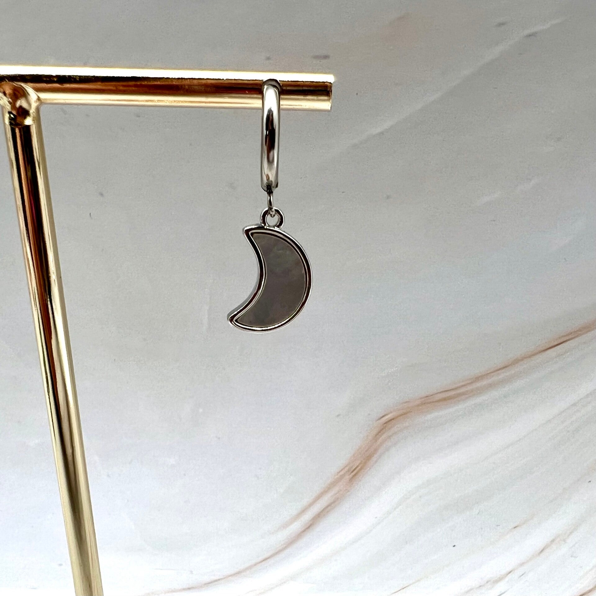Aan deze mooie oorbel hangt een maantje met in het midden parelmoer verwerkt. De oorbel is niet zwaar om te dragen.