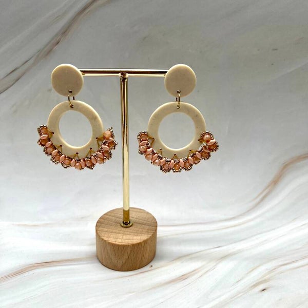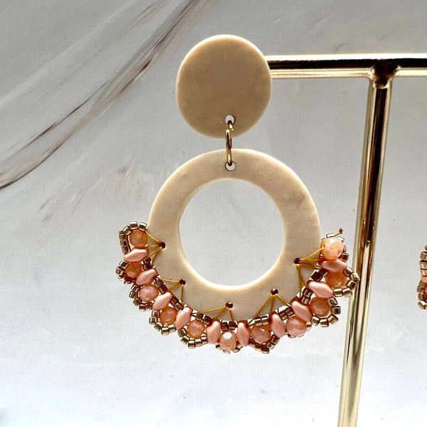 Deze mooie oorbellen zijn gemaakt van klei, en zijn afgewerkt met kralen. Deze oorbellen zijn uniek en door twee creatieve meiden met de hand gemaakt. De hanger is niet zwaar om te dragen.