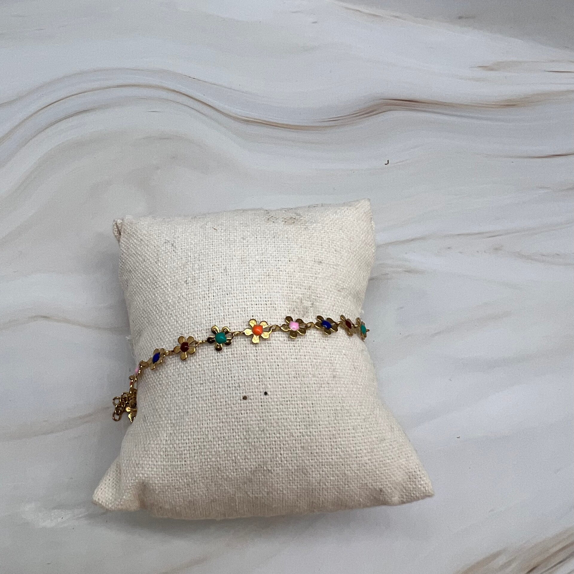 Dit leuke enkelbandje heeft gekleurde bloemetjes. De lengte van het enkelbandje is 21 cm t/m 25 cm.