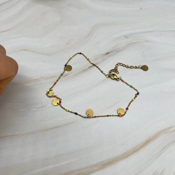 Dit leuke enkelbandje heeft gekleurde kleine balletjes en heeft leuke muntjes eraan. De lengte van het enkelbandje is 24 cm t/m 30 cm.