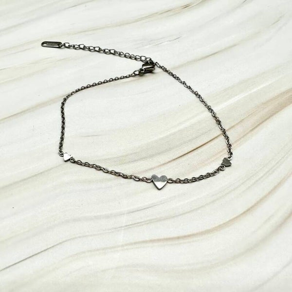 Dit leuke enkelbandje heeft drie hartjes, grote in het midden en aan de zijkant kleinere hartjes. De lengte van het enkelbandje is 21 cm t/m 25 cm.