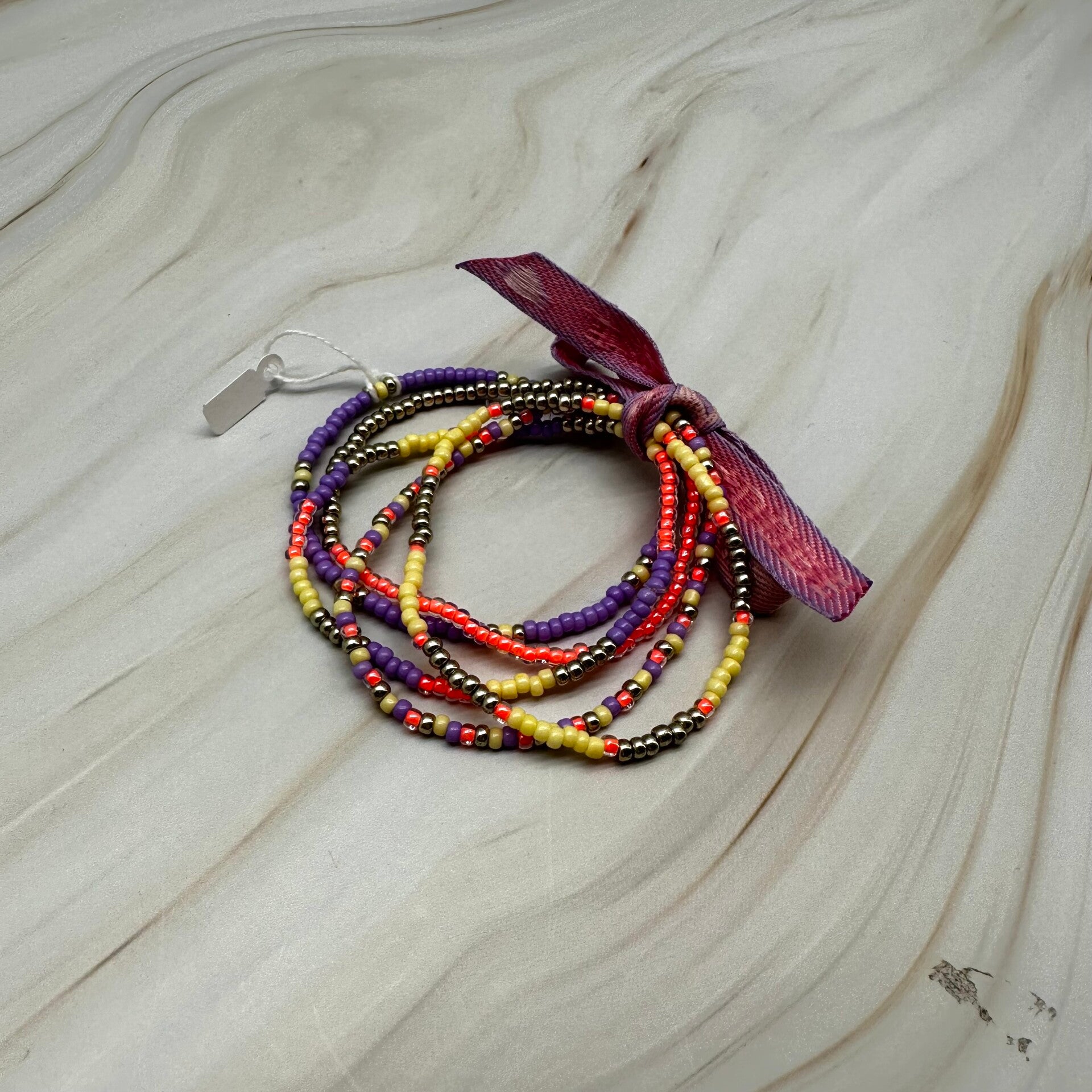 Een feestje voor om je pols. Dit setje bestaat uit 5 armbandjes. Deze zijn gemaakt van hoogkwaliteit miyuki kralen. De kleuren zijn, lia, geel, neon en zilver. Hij is afgemaakt met een zomerse strik. Deze kunt u eventueel er afknippen als u dat niet mooi vind.