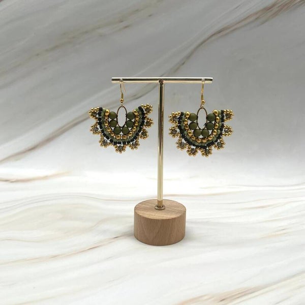 Deze unieke oorbel zijn door mijn handen gemaakt. Het is een mooie waaier van groen, zwrt en gouden kralen. De hanger is niet zwaar om te dragen. Wil je eventuele andere knopjes? dan kunt u dit aangeven in de opmerkingen.