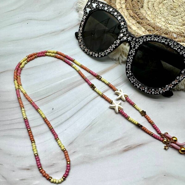 Deze leuke brillenkoord is gemaakt door Lizzy zij liep een dagje mee voor school. Zij heeft de kleuren en bedels zelf samengesteld. Deze brillenkoord heeft de volgende kleuren, licht geel, rose, goud en perzik. Met een schelpjes en bloemetjes kralenl. De brillenkoord is handig voor je zonnebril of bijvoorbeeld je leesbril.
