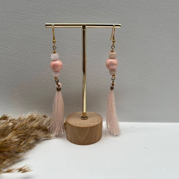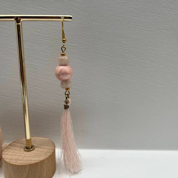 Deze oorbel heeft drie natuurstenen en een lange kwast aan de onderkant. De hanger is niet zwaar om te dragen.