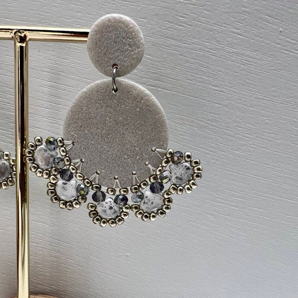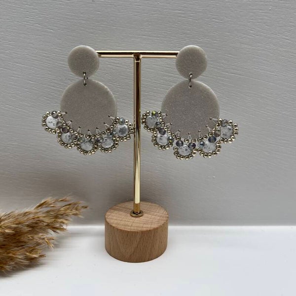 Deze mooie oorbellen zijn gemaakt van klei, en zijn afgewerkt met kralen. Deze oorbellen zijn uniek en door twee creatieve meiden met de hand gemaakt. De hanger is niet zwaar om te dragen.