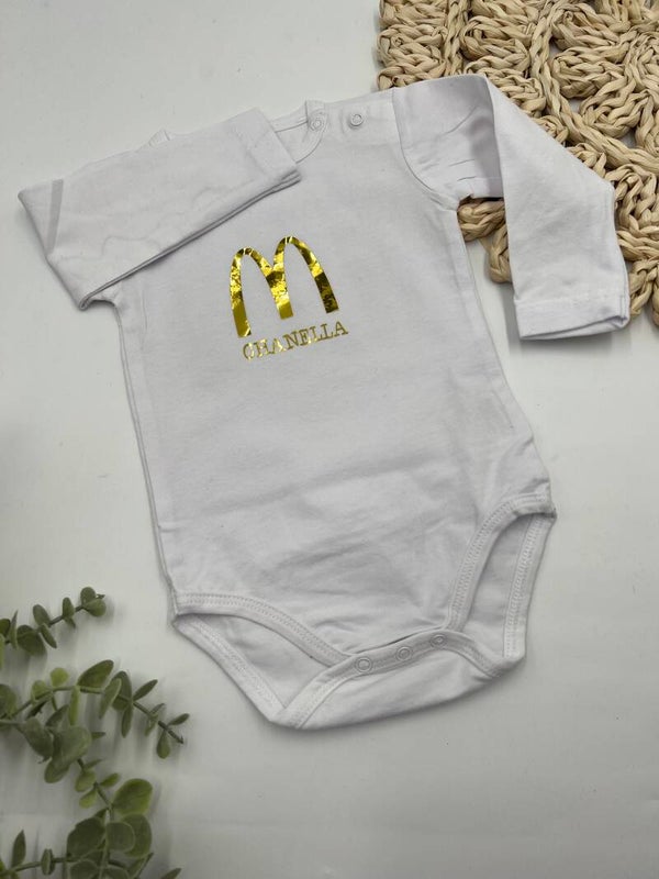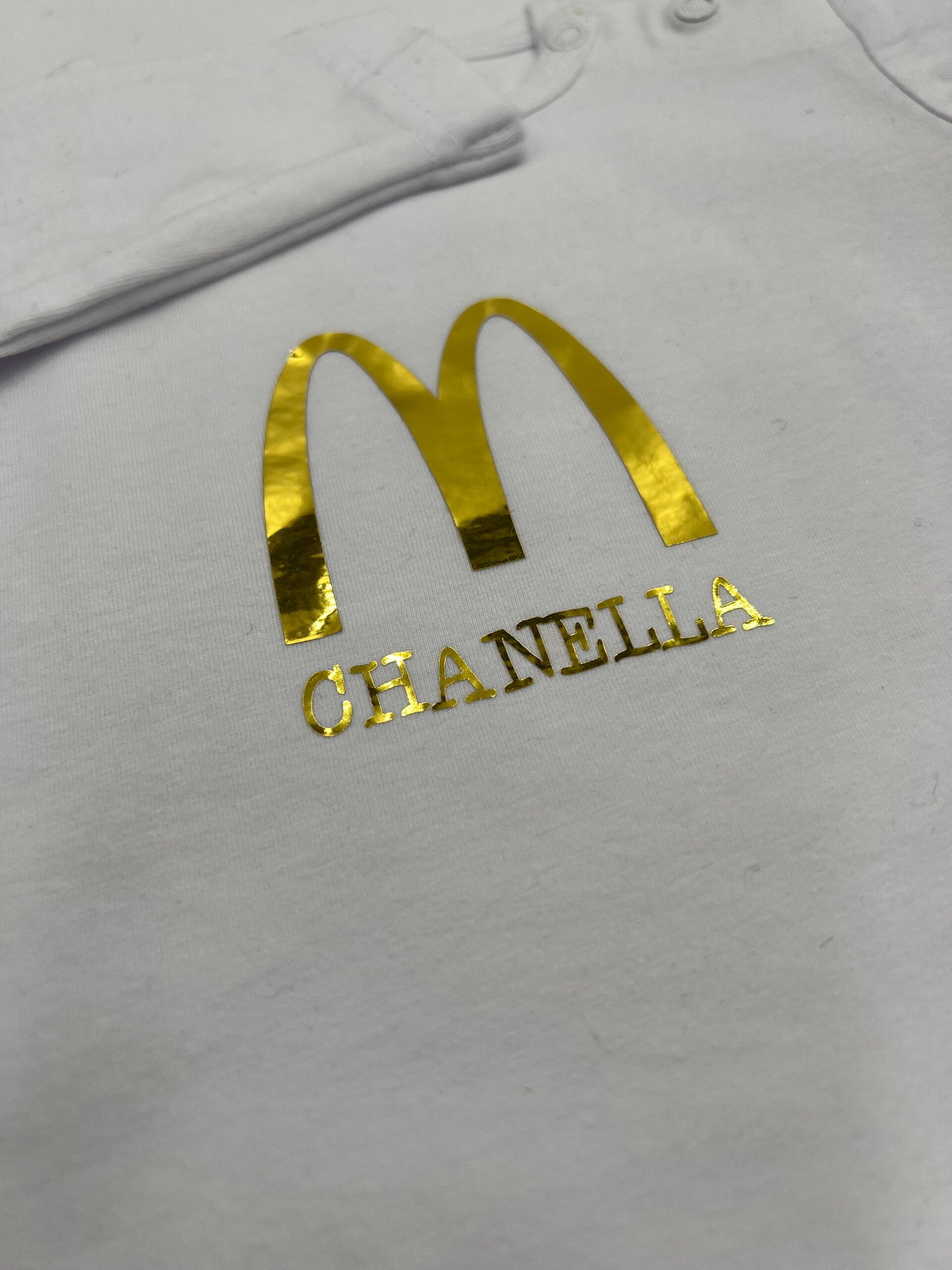 Romper laten bedrukken. Hier kun je zelf invulling aangeven. Denk aan een logo, naam of iets grappigs. Bij een romper wordt alleen de voorkant bedrukt. De rompers komen bij de Hema vandaan. Je kun in het formulier aangeven, welke maat en welke bedrukking je wilt.