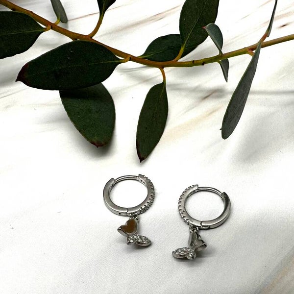 Deze oorbel heeft een vlinder als hanger. De ring en de helft van de vlinder is bedekt met kleine witte diamantjes.